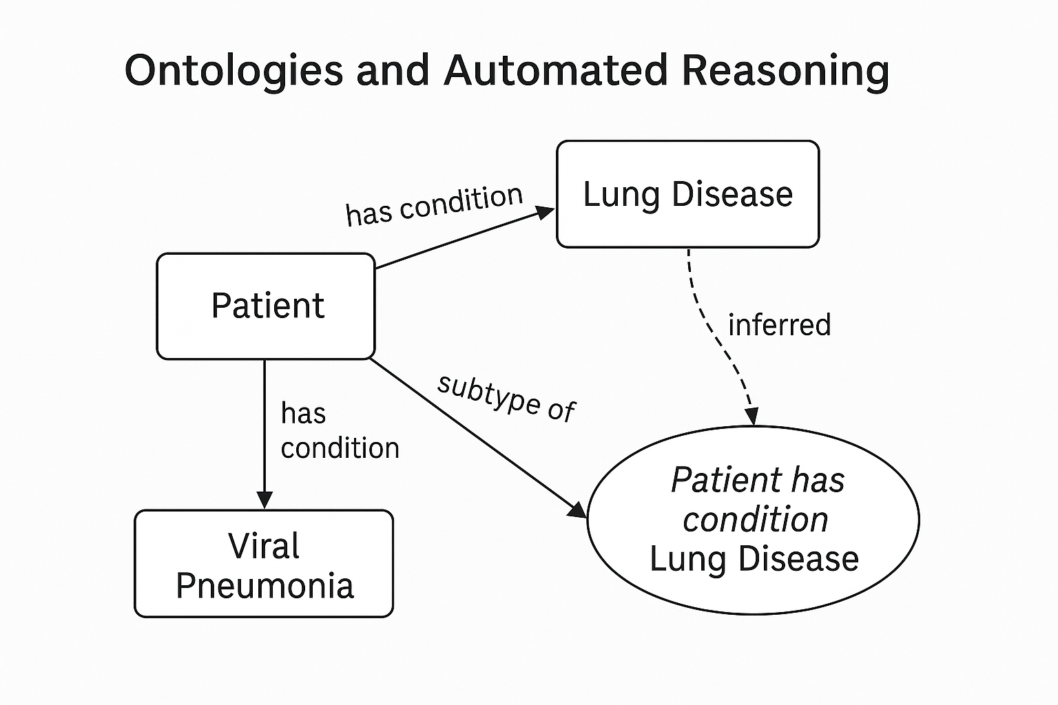 Here, meaning is partially explicit—relationships like "hasDiagnosis" clearly connect entities—but the precise meaning of "Patient," "Diagnosis," or "U07.1" remains informal and loosely defined. There's no clear semantic definition ensuring that systems interpret these concepts consistently. Knowledge graphs provide flexibility and connectivity, but often lack rigorous semantic clarity or reasoning capabilities.