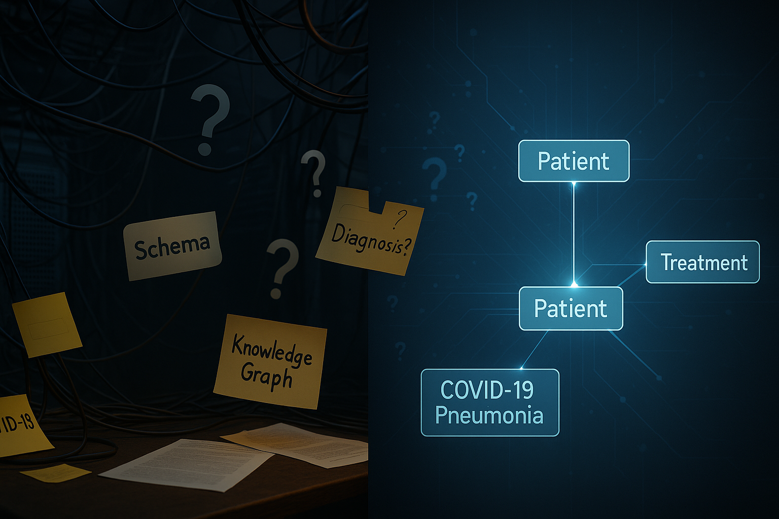 Here, concepts ("Patient," "Diagnosis," "COVID-19 Diagnosis") and relationships are explicitly defined with semantic clarity and logical constraints. The ontology precisely defines what a patient and diagnosis mean, specifies their logical structure, and includes reasoning constraints—for example, explicitly defining "COVID19Diagnosis" as equivalent to having the diagnosis code "U07.1."