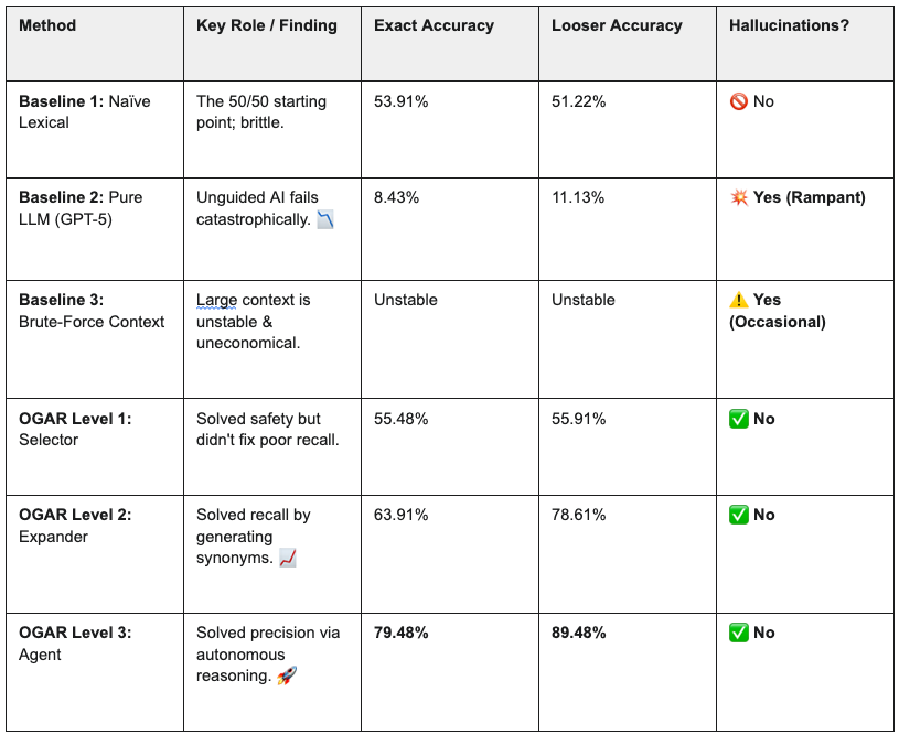 Our journey through 1,150 clinical terms delivered a clear verdict: for tasks that demand precision, the path to reliable AI is not paved with bigger models or vaster context windows, but with smarter boundaries. By transforming a powerful LLM from an unguided guesser into a grounded decider, the OGAR framework moved us from a catastrophic <9% accuracy to a robust ~80% , all while eliminating hallucinations and using a small, cost-effective model.