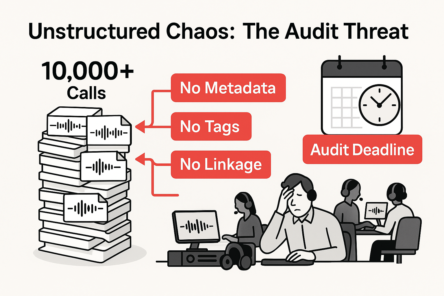 One of our clients faced a high-stakes regulatory audit with little time and even less structure. Their call center had logged over 10,000 recorded phone calls—completely unorganized and entirely unlabeled. There were no tags, no metadata, and no linkage to downstream records. The only fallback plan involved listening to each call individually, deducing the caller's identity from the audio, and manually verifying whether their issue had been resolved. This process, if followed, would have consumed weeks of staff time across multiple departments and left them with unverifiable edge cases. The client asked us for help.