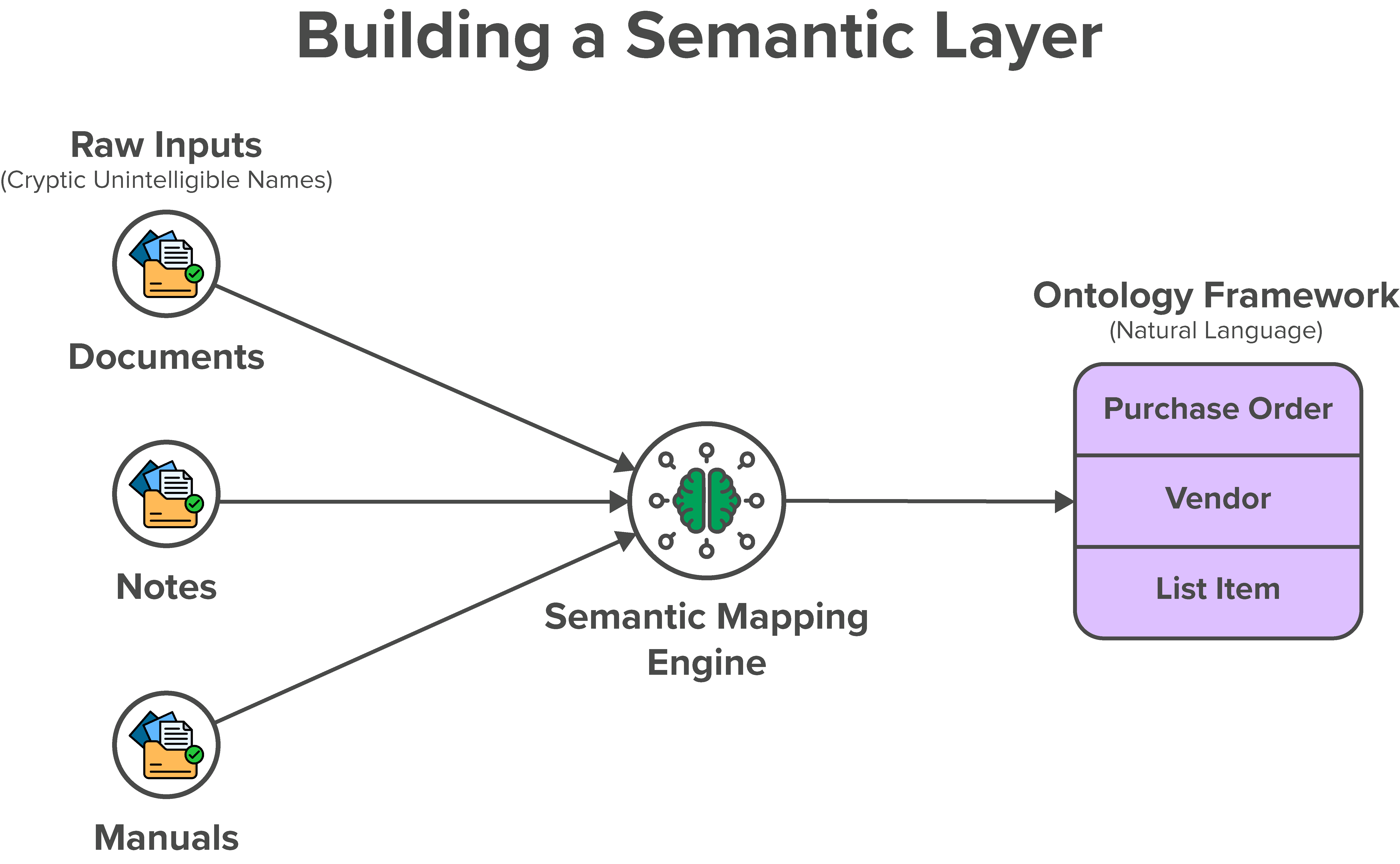 The first thing I did was establish a semantic layer. Using SemDB, I ingested the vendor's internal documentation—everything from training manuals to developer notes—and applied standard embedding techniques to generate first-pass mappings between domain language and database elements. I then aligned those embeddings with the live schema, creating a crosswalk between real table/column names and human-meaningful concepts like "purchase order," "line item," or "vendor."