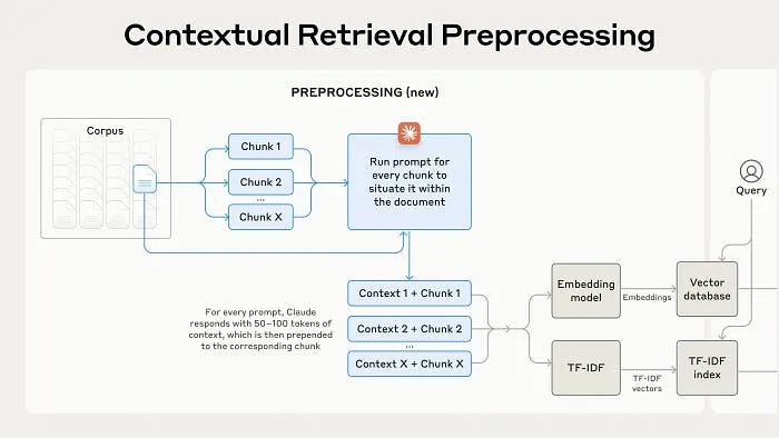 - Contextual Embeddings: Before creating embeddings for text chunks, explanatory context is added to each chunk. This context is specific to the chunk and situates it within the broader document, improving its relevance when retrieved. For example, a chunk stating "The company's revenue grew by 3%" might be augmented with the context "This chunk is from an SEC filing on ACME Corp's performance in Q2 2023."