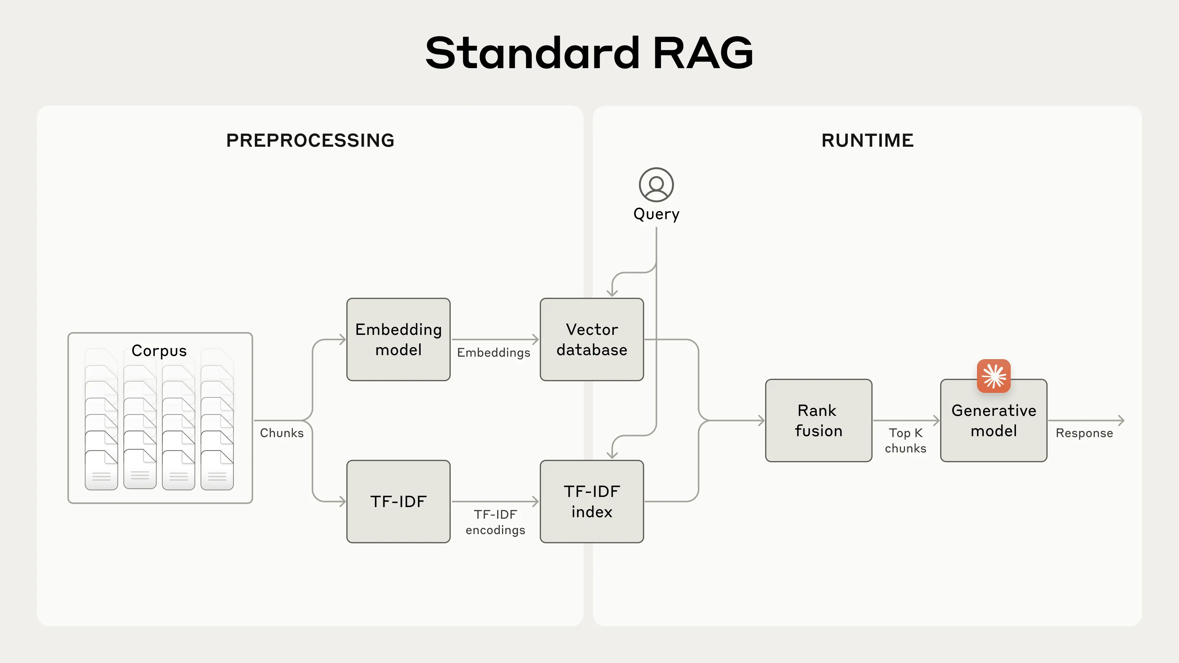 - Contextual BM25: BM25 is a ranking function that uses lexical matching to find exact term matches. By applying BM25 in conjunction with semantic embeddings, Contextual Retrieval ensures that both exact matches and semantic similarities are used to retrieve the most relevant chunks, improving the overall retrieval accuracy.