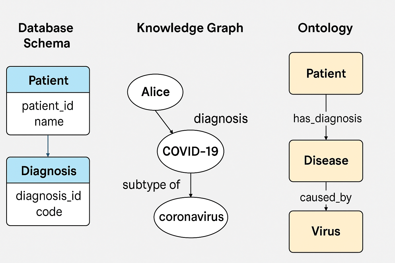 In this schema, data relationships are clearly defined (e.g., diagnoses linked to patients), but the schema does not explicitly encode the meaning of "patient," "diagnosis," or "diagnosis_code." So what's missing?