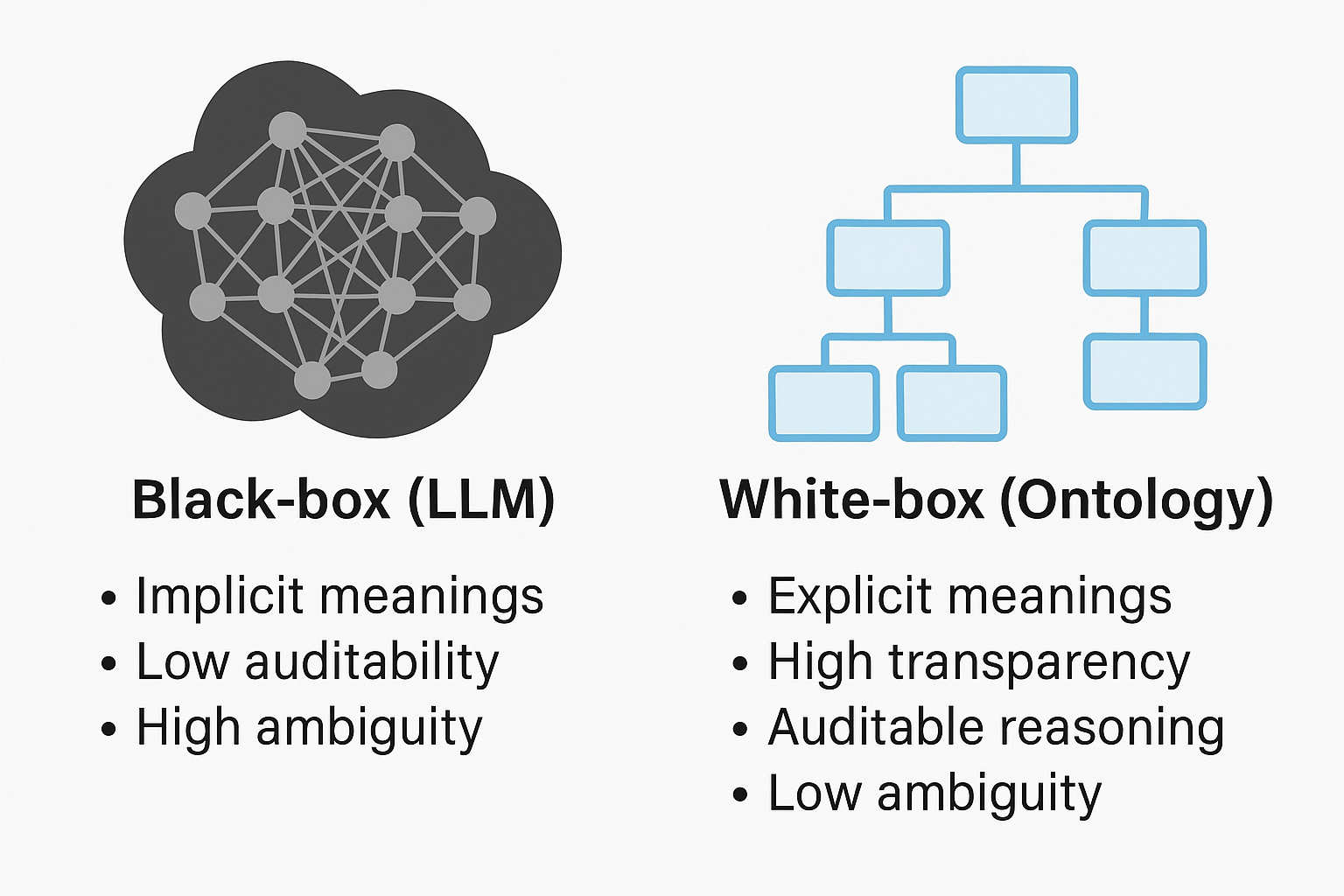 By contrast, ontologies occupy the exact opposite position on the spectrum of meaning representation. Ontologies are, by definition, explicit , transparent , and "white-box" . They define meanings clearly and explicitly, providing unambiguous representations of concepts and relationships. If an ontology says explicitly that "COVID-19 pneumonia is a type of viral pneumonia caused by the SARS-CoV-2 virus," this definition is precisely captured and traceable. There is no ambiguity in interpretation. Ontologies clearly delineate what is known, how concepts relate, and how inferences can be drawn explicitly from logical definitions.