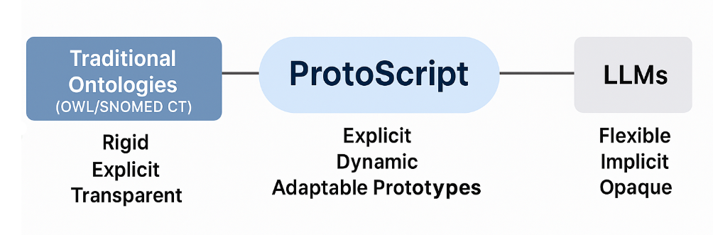 ProtoScript suggests a promising approach: blending the explicit semantic rigor of traditional ontologies with the flexibility and dynamic adaptability reminiscent of modern computational methods. Rather than static classes and complex axioms, ProtoScript employs dynamic prototypes, lightweight reasoning, and intuitive categorization—potentially addressing the weaknesses of both ontologies and LLMs.