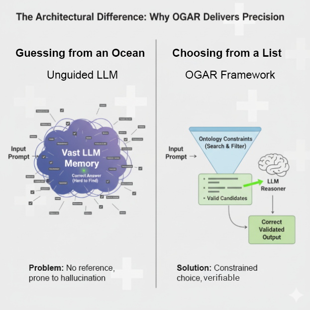 Ontology-Guided Augmented Retrieval (OGAR) fixes this by changing the nature of the test. Instead of an essay, we give the LLM a multiple-choice exam where the ontology provides the only valid answers. The LLM’s job is no longer to recall but to reason and select.