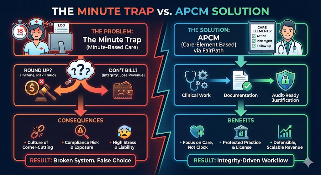 In that moment, the nurse faces a choice that should never exist in a legitimate care-management model. Do they round the time up so the practice can bill? Or do they leave it as-is and lose revenue for work that genuinely occurred? This is the moment where the system forces good clinicians into untenable decisions. This is the moment I call