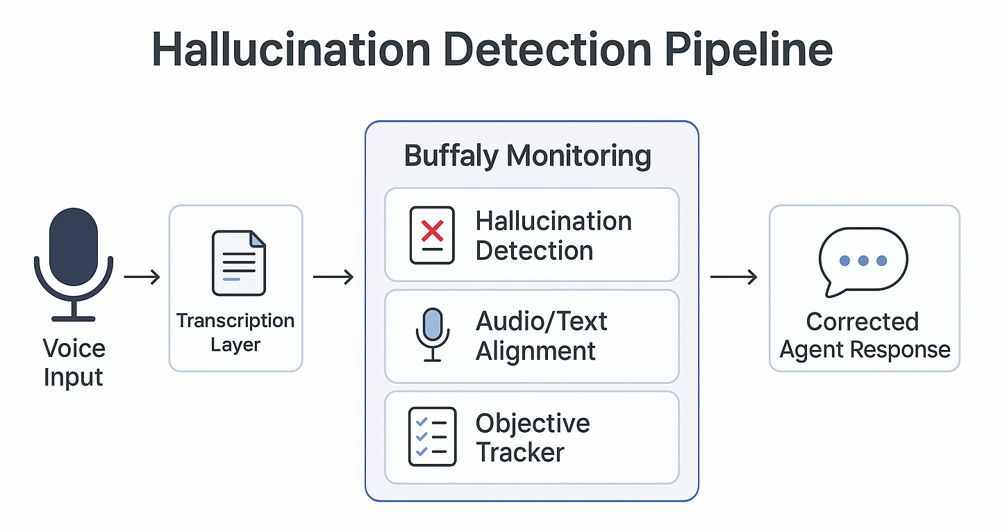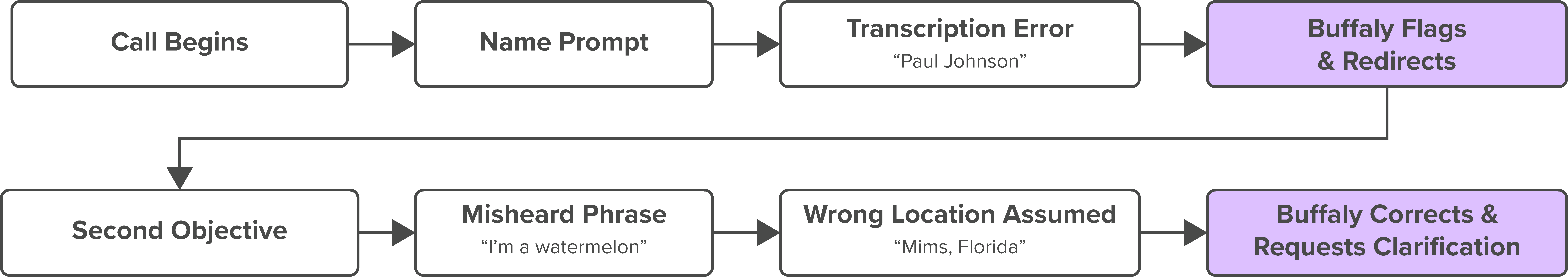 Buffaly intercepts this, extracts the agent’s assumptions, and checks for supporting data. It finds none—flagging hallucinations and identifying the objective as incomplete. It then prompts the agent to clarify instead of moving forward.Later in the call, the user says “I’m a watermelon,” and the agent interprets it as “Mims, Florida.” Buffaly uses ontology-based reasoning to identify that this is neither supported by the audio nor by the conversation logic. It corrects the location, and redirects the agent to confirm it.