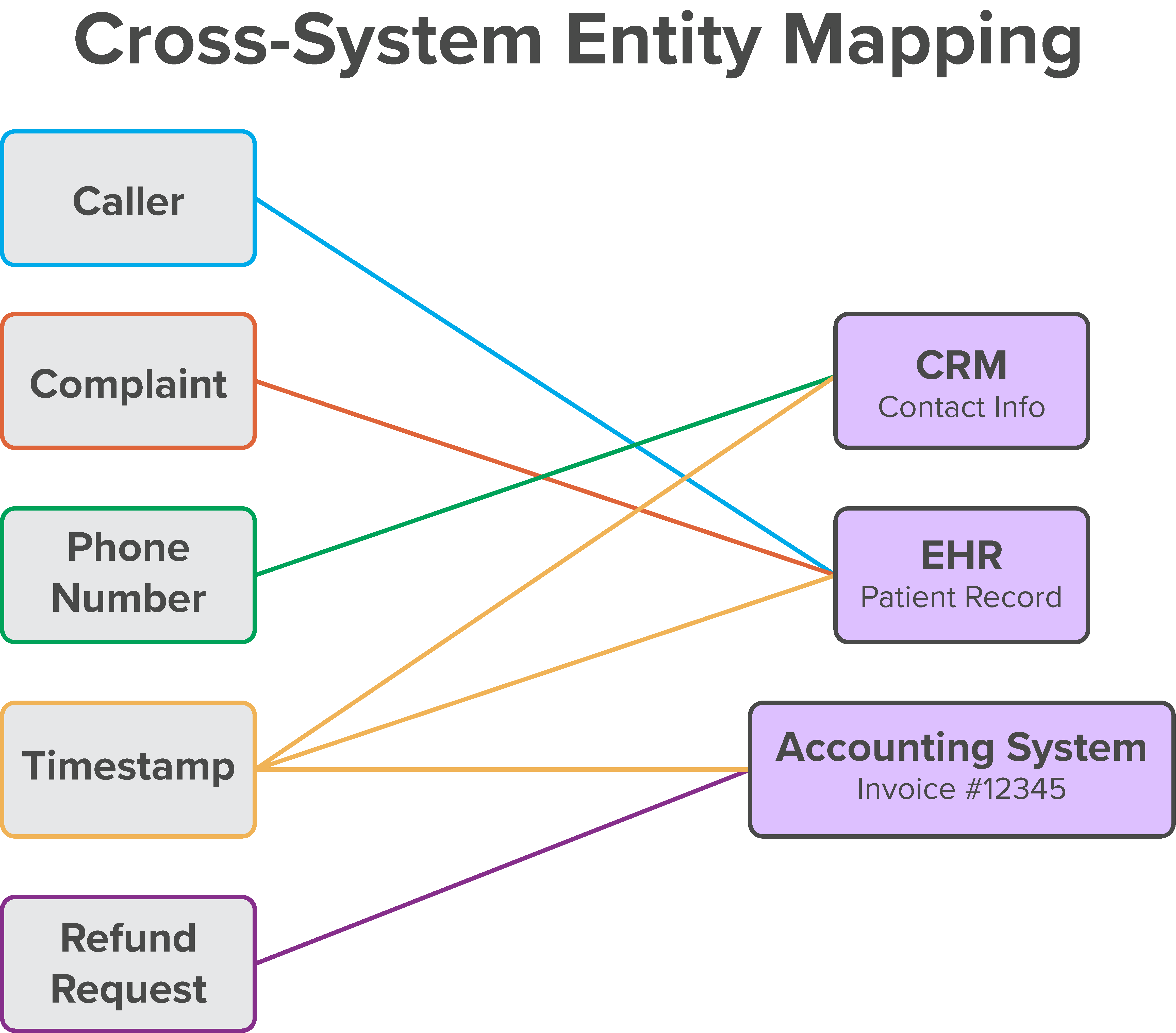 From these transcripts, we constructed an operational ontology tailored to the domain. Using custom extraction pipelines, we identified and normalized any available signal in the calls: names, Medicare numbers, email addresses, phone numbers, complaint types, refund requests, and more. We enriched this semantic graph with call metadata—most importantly, the phone number of origin—and began mapping these entities against records in the client's CRM and EHR systems.