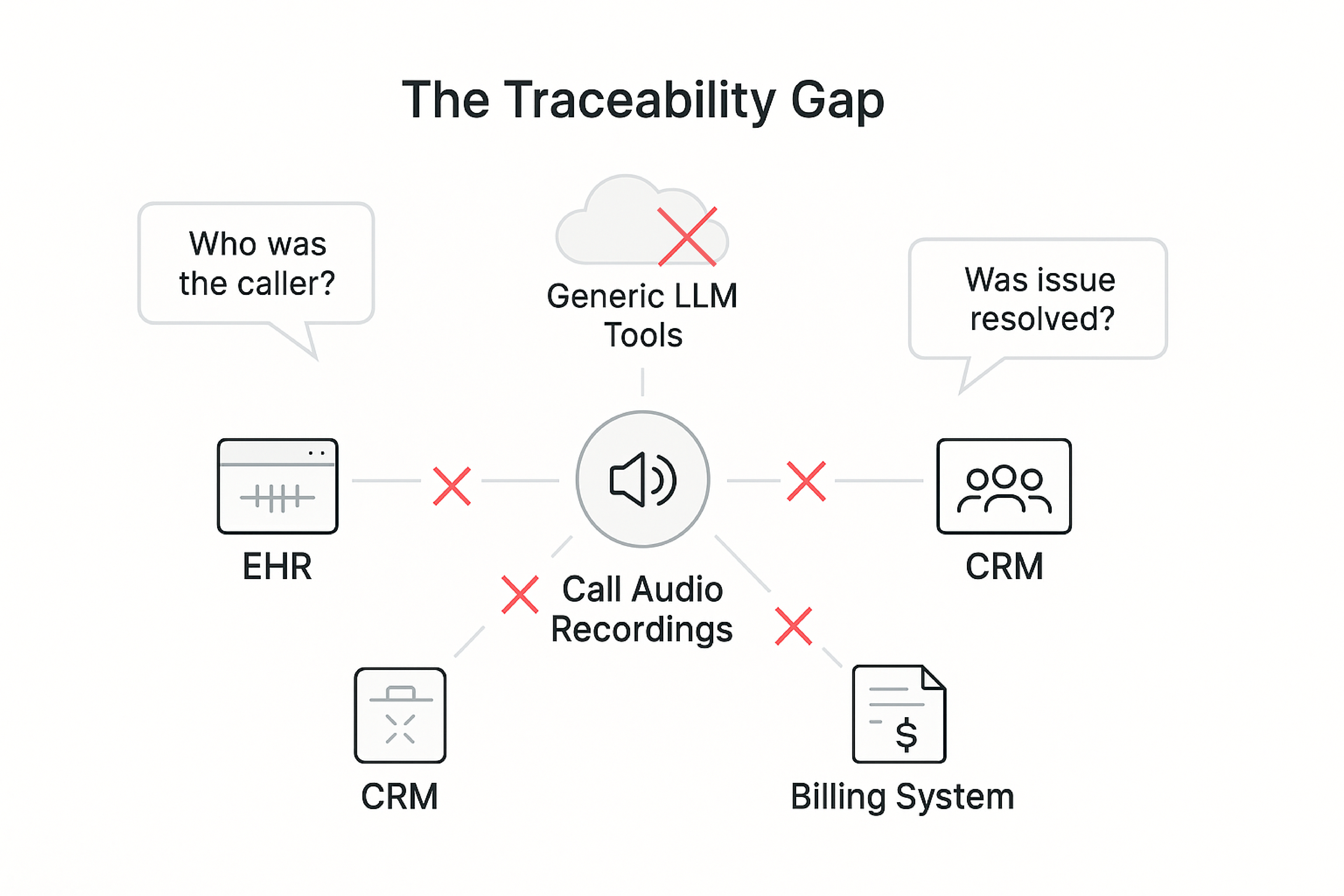 The core problem was traceability. The organization had no systematic way to know what any given call was about, who the caller was, or whether their issue had been resolved. These weren’t optional questions; the audit required definitive answers. Furthermore, their operational systems—EHR, CRM, billing—were all disconnected from the raw audio data. Standard tools offered either generic transcription with no semantic structure, or search over embeddings without traceable verification. Neither option provided the clarity, security, or determinism needed to pass an audit.
