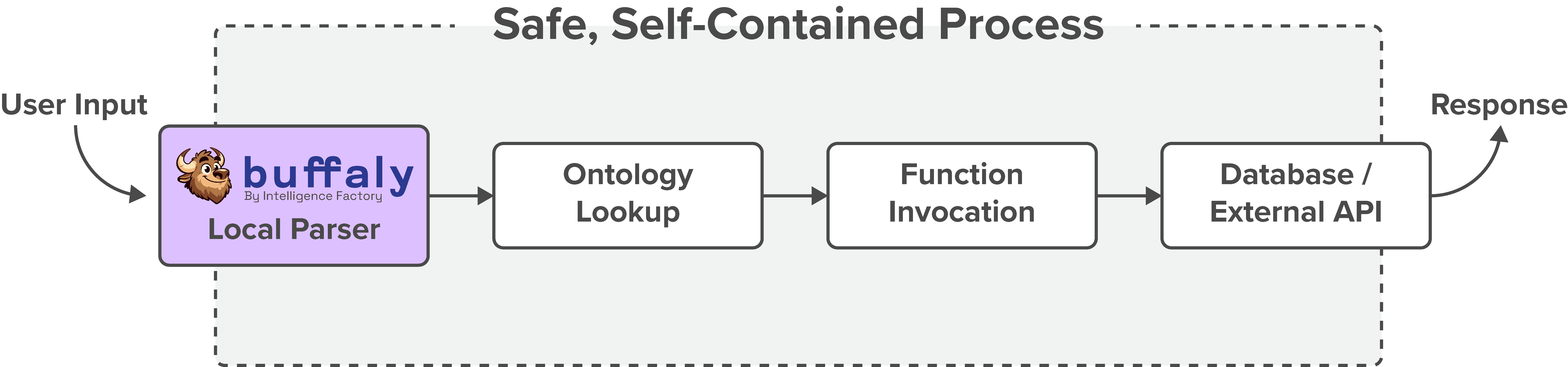 Once the local parser interprets the request, it uses the ontology to map entities and intents. The result is a function class invocation with concrete parameters. From there, Buffaly can execute SQL, call a stored procedure, or hit an internal REST API—whatever the system requires. All of this happens locally. No context windows, no external calls, no surprises.